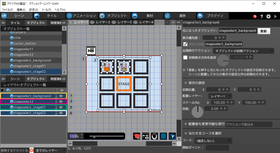 クリアしたステージ画像を変化させるには、今作ったオブジェクトを、カーソルと、ステージ画像のオブジェクトに分割します。具体的には、下図のように、ウサギのオブジェクトを個別に作り、変数やスイッチで表示する素材を変化させます。