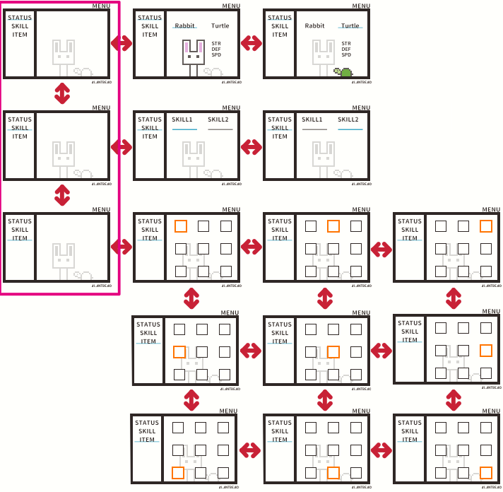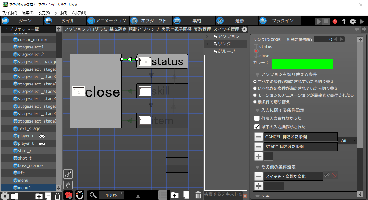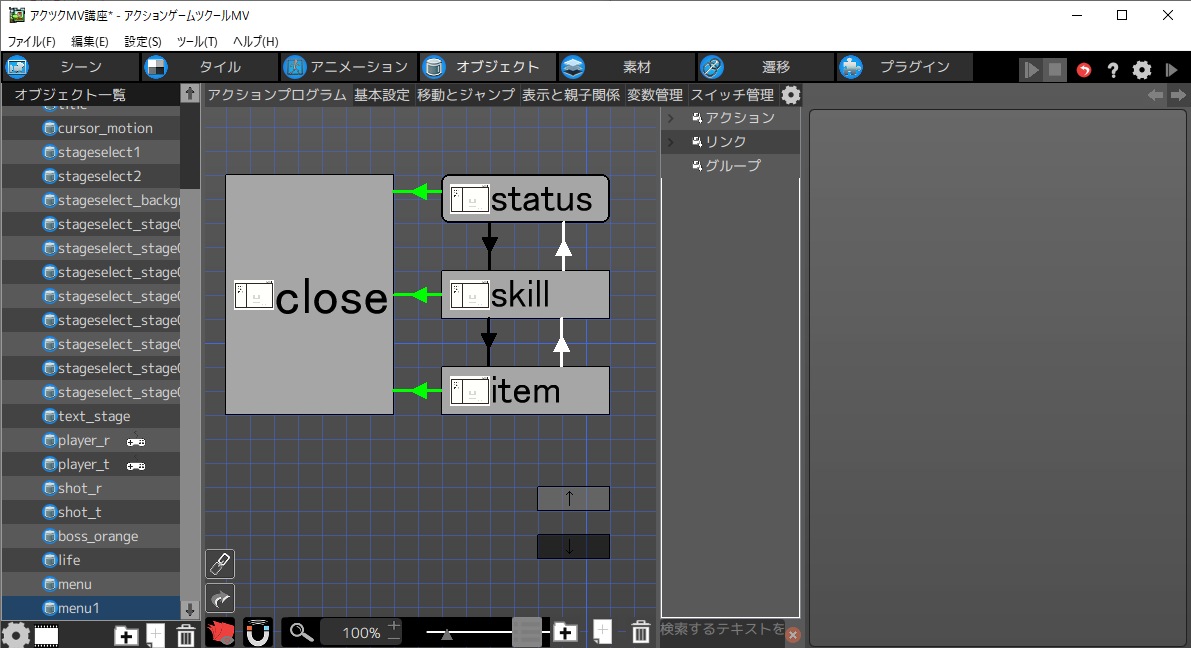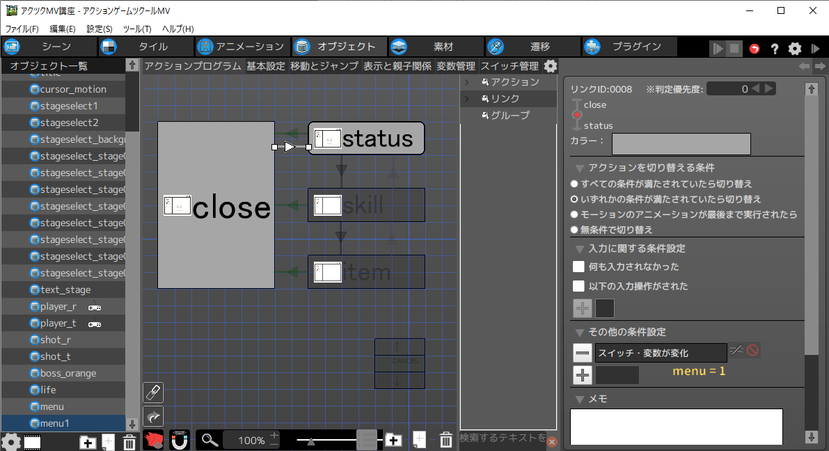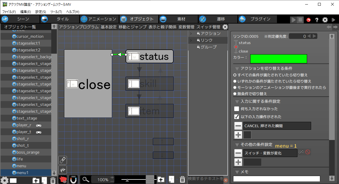 このままだと、一度[close]になったらもう一度メニュー画面を開いても操作が出来ません。 共通変数menu = 1になったら[status]に遷移するようにリンクを繋げる必要があります。
