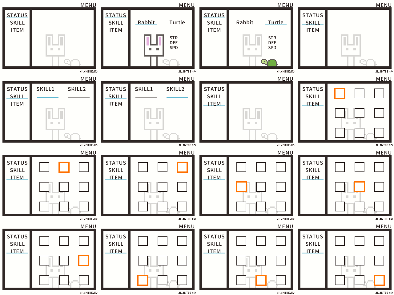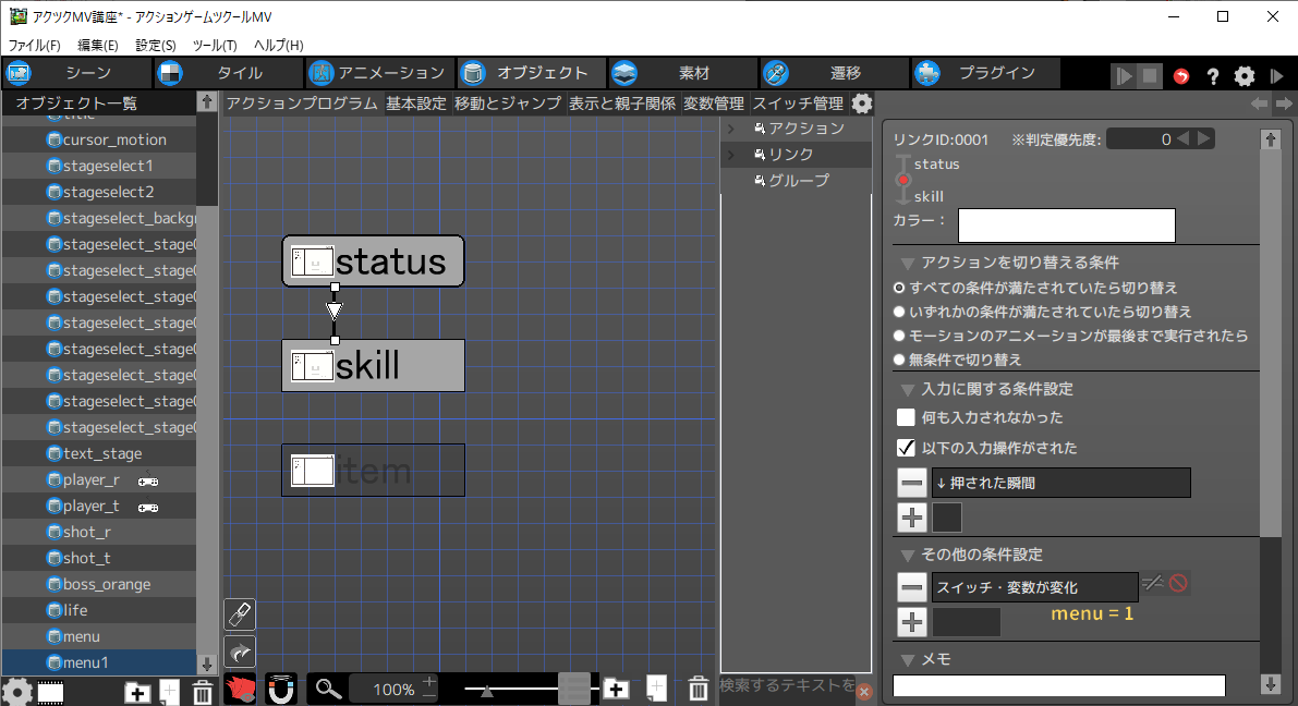 - 1カーソル移動用のアクションを作成します。ここでは、[status][skill][item]の3つの空アクションを追加します。