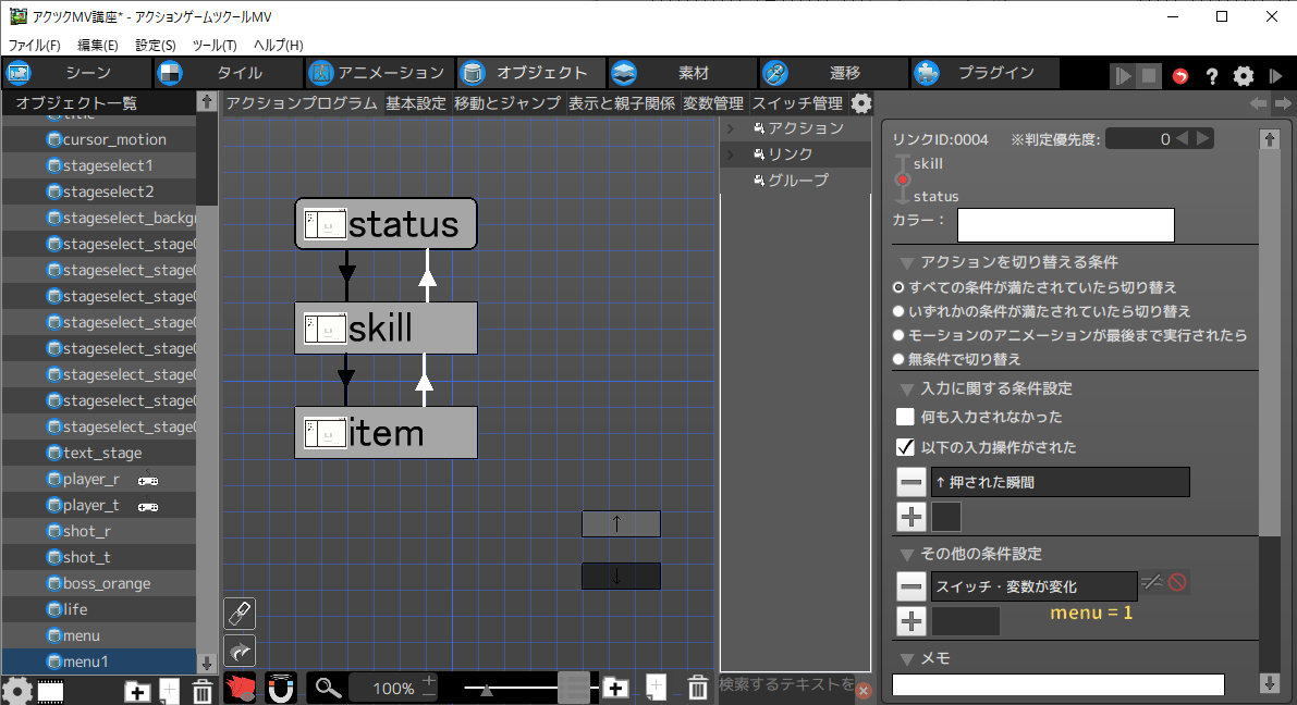 | 黒矢印 | [↓を押された瞬間] and [スイッチ・変数が変化 共通変数:menu = 1] |