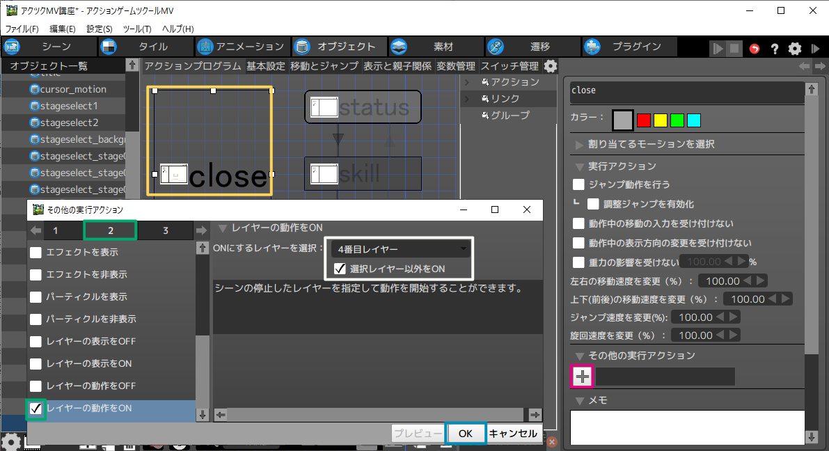 - 3その他の実行アクションウィンドウがポップアップしますので[2]タブから「レイヤーの動作をON」にチェックを入れます。