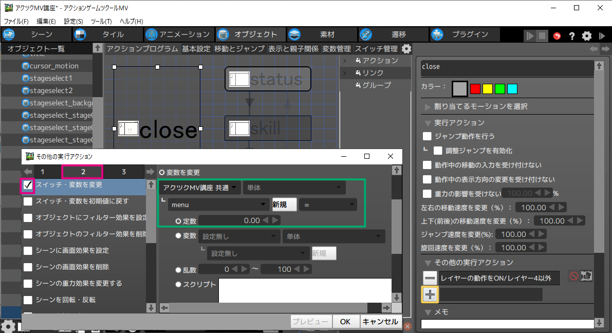 - 7その他の実行アクションウィンドウがポップアップしますので[2]タブから「スイッチ・変数を変更」にチェックを入れます。