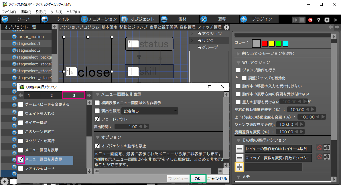 - 15その他の実行アクションウィンドウがポップアップしますので[3]タブから「メニュー画面を非表示」にチェックを入れます。