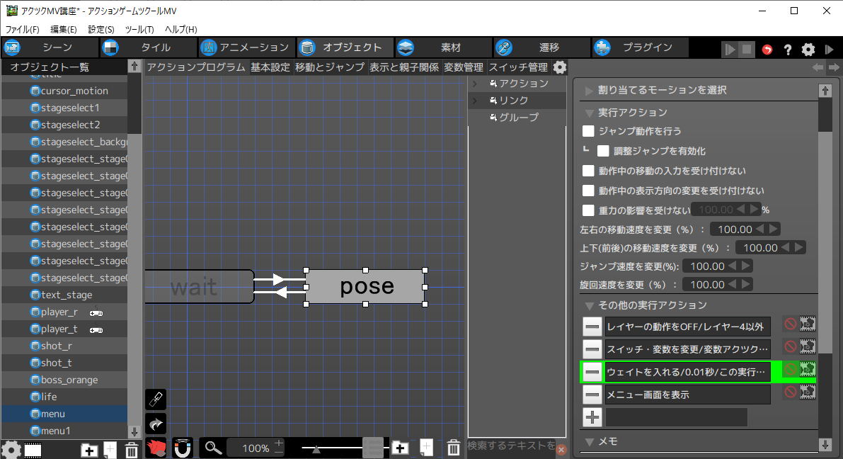 アクションを追加したのに実行されないケースがあります。不具合ではありますが、処理と処理の間に0.01秒のウェイトを挟むと正常に動作することがあります。動画のように、メニュー画面が表示されて、「画面が停止しない」、「メニューが動作しない」場合は、[メニュー画面を表示]のアクションの前にウェイトを入れてみましょう。