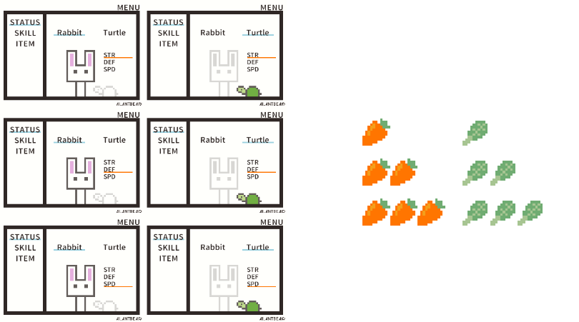 | [status_rabbit(DEF)]→[status_rabbit(DEF+)] | [→が押された瞬間] and [共通変数/menu = 1.00]、[共通変数/rabbit_DEF < 3.00] |