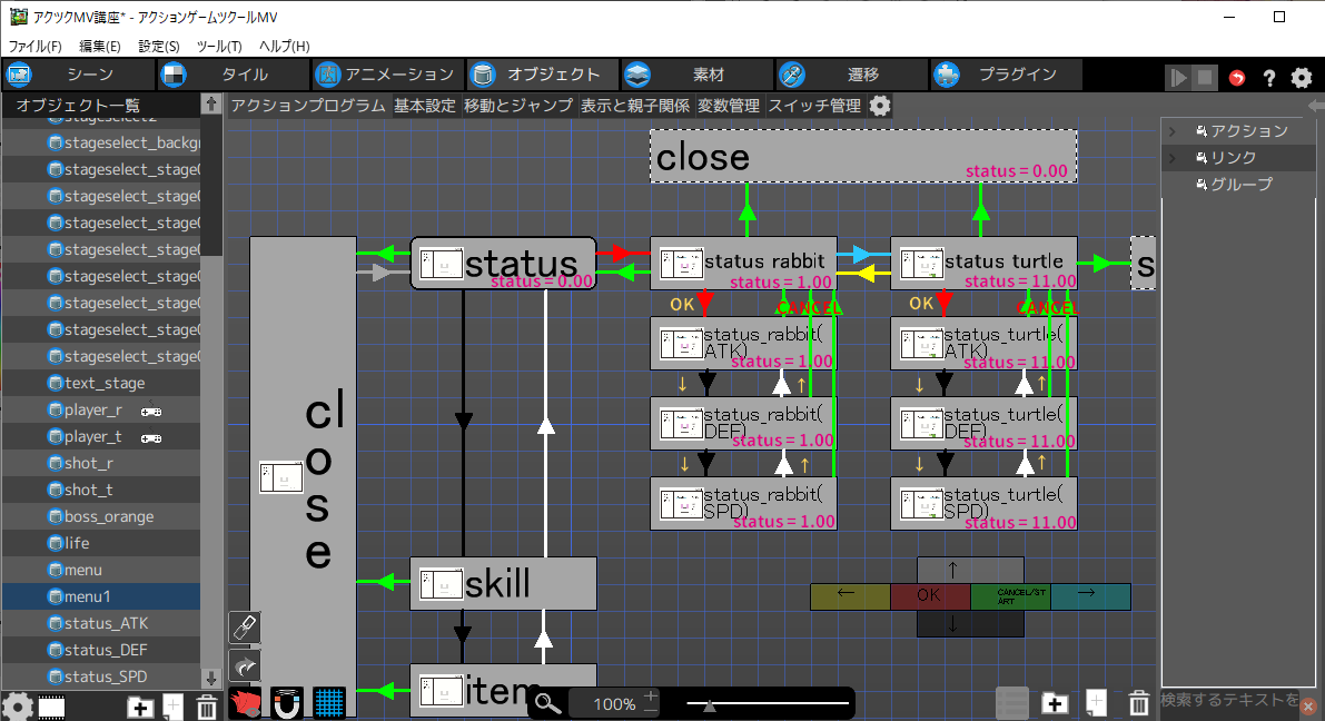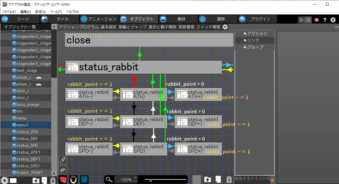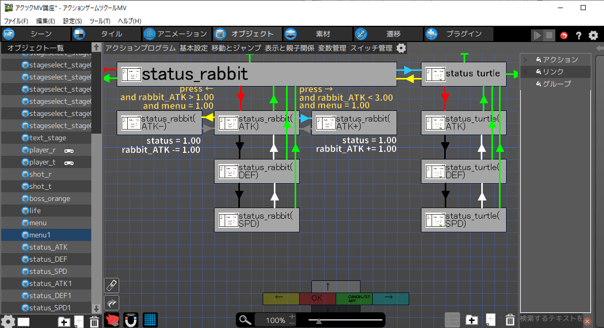 | [status_rabbit(DEF)]→[status_rabbit(DEF-)] | [←が押された瞬間] and [共通変数/menu = 1.00]、[共通変数/rabbit_DEF > 1.00] |