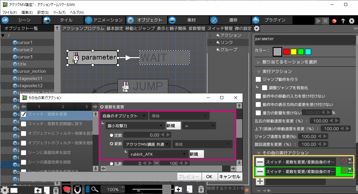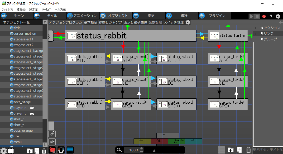 | [status_rabbit(DEF-)] | 共通変数/status = 1.00、共通変数/rabbit_DEF -= 1.00、(プレイヤーオブジェクトの変数を変更など) |