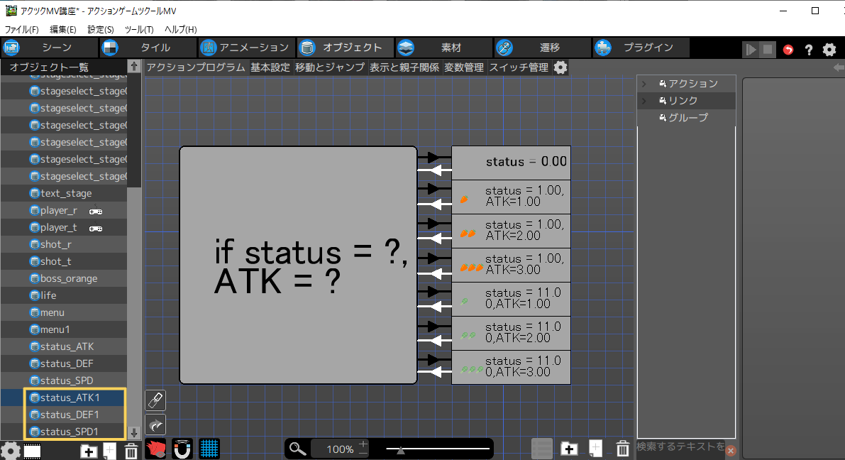 | [if status = ?,ATK = ?]→[status = 1.00,ATK=2.00] | その他の条件:[共通変数/status = 1.00] and [共通変数/rabbit_ATK = 2.00] |