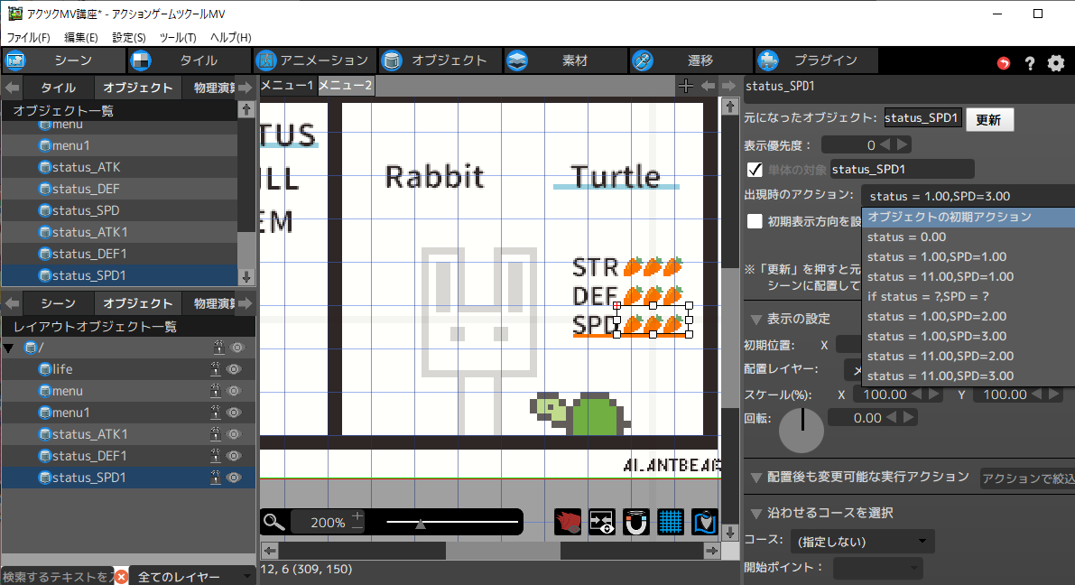 | [status_rabbit(SPD-)] | 共通変数/status = 1.00、共通変数/rabbit_SPD -= 1.00、(プレイヤーオブジェクトの変数を変更など) |