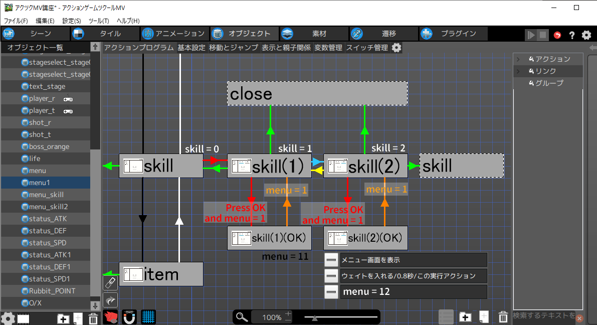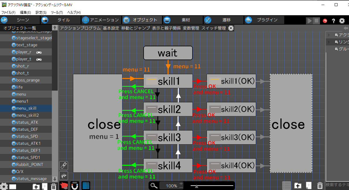 また、OKボタンの遷移条件にスイッチを使うことで、未習得のスキルを使用できないようにすることもできます。
