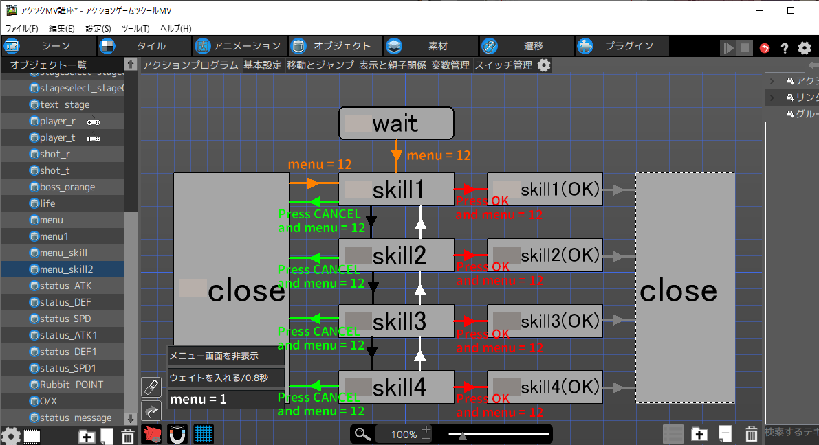 ※SKILL2のパターンを作る場合は、メニュー画面の演出時間分、ウェイトを入れる必要があります。メニュー画面は表示演出中に「メニューを非表示」が実行されても非表示になりませんので、既に表示されている別のメニューが閉じてしまい、想定通り動かなくなります。