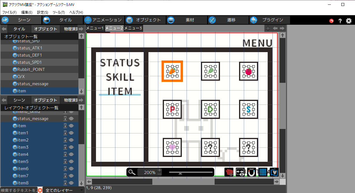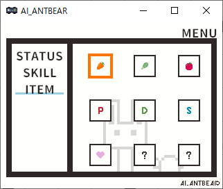 図のように9個のアイテム欄がある場合、それを表示する9個のオブジェクトを用意する必要があります。 アイテムを固定せずに、拾った順番に表示させようとすると、[アイテムの種類]×[枠]通りのアイコンを表示させる処理を作る必要があります。 また、カーソルの位置と、その位置にあるアイテムの種類を条件に、そのアイテムを使った時の処理をするオブジェクトを作る必要があります。 アイテムの場所入れ換え、ソートまで考慮すると、プログラムで作るよりも複雑かもしれません。