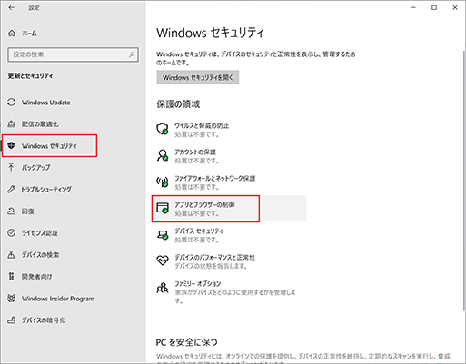 3.「Windows セキュリティ」→「アプリとブラウザーの制御」を選択。