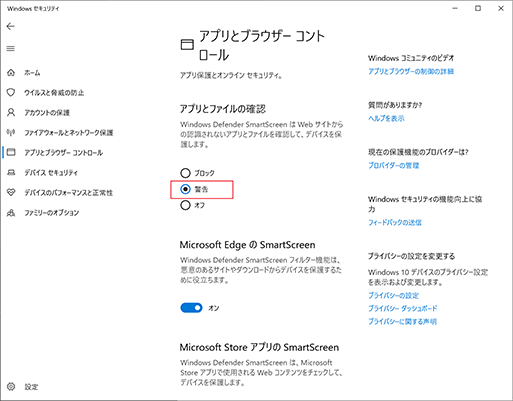 4.「アプリとファイルの確認」が「ブロック」である場合、インストールが完了するまで「警告」に変更。