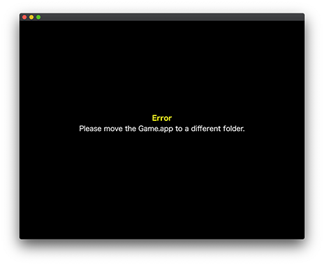 MacOSの仕様により、このまま起動するとセーブデータが保持できない状態であるため、メッセージを表示しています。 GameまたはGame.appを現在のフォルダから移動して、再度実行をお願いします。