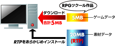 RTPがあらかじめインストールされていれば、ゲームに必要な素材は、すでにパソコンの中に入っていますので、最低限のゲームデータをダウンロードするだけで済みます。毎回、ゲームデータのみで済みます。